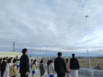 全校児童、全教職員が屋上に上がり、ドローンによる空撮をしました。