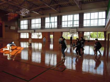 体育館では、5、6年生が一緒にドッジボールを楽しんでいました。
