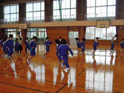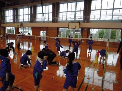 別のコートでは、いつも通り、縦割り班ごとにラダーやミニハードルを使ったトレーニングをしました。
