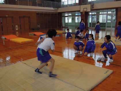今日は、「マットを使った運動遊び」ゆりかごやかえるの逆立ちをしたり相撲を取ったりしました。