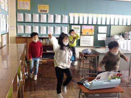 音楽では、「こうしんきょく」を聴きました。子供たちからは「なんだか動きながらリズムをとりたくなってきた」「楽しくてわくわくする曲だな」という感想が聞かれました。曲を聴いたあとには、実際に体を動かし、この曲のリズムを味わいました。行進したり、ジャンプしたり、楽しそうに動く子供たちの姿が見られました。