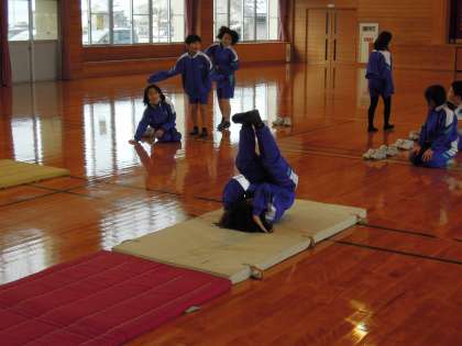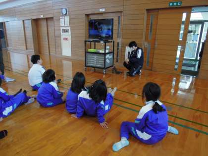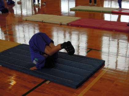 今日は、後転の模範演技(動画)を視聴して、各自よりきれいな後転ができるよう練習に取り組んでいました。