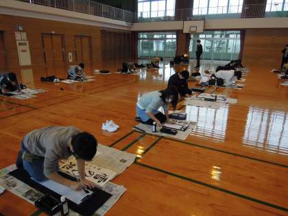 全校児童が体育館に集まり、一斉に揮毫し始めました。