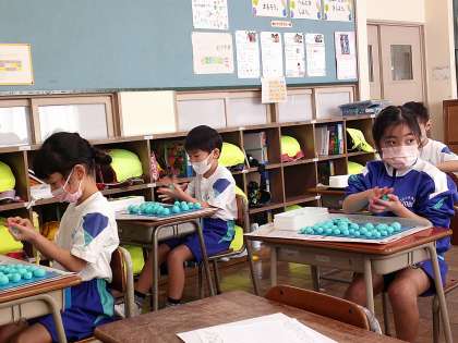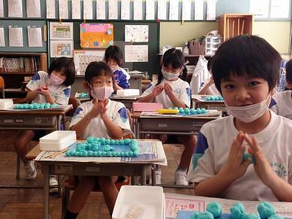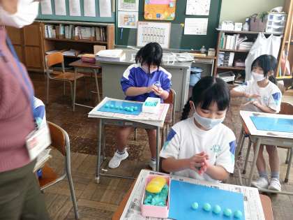 図画工作科では「でこぼこ はっけん」の学習を行いました。粘土で、身の回りにあるでこぼこをうつしとる学習です。まずはじめに、うつしとるための粘土の準備です。小さなお団子をたくさん作りました。
