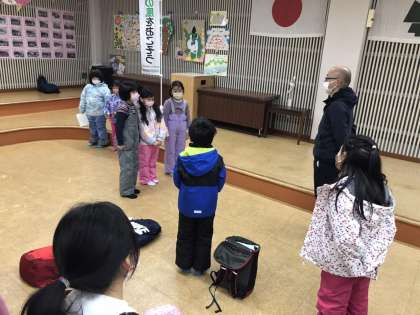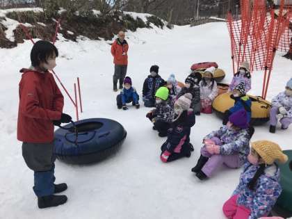 1、2年生は、立山青少年自然の家に着き、入所式を終え、チューブそりの活動を始めました。