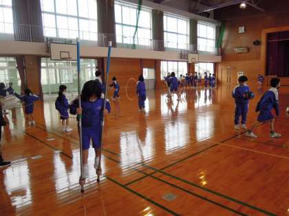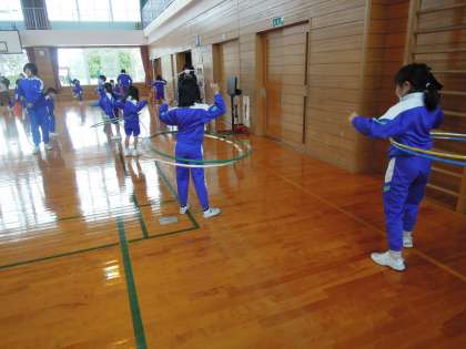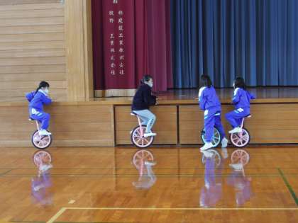 フラフープ、竹馬、一輪車といった運動(遊び)に挑戦している子供たちです。