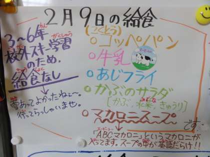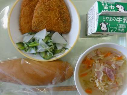 今日の給食です。スープには、アルファベットの文字の形のマカロニと星形のニンジンが入っていました。
