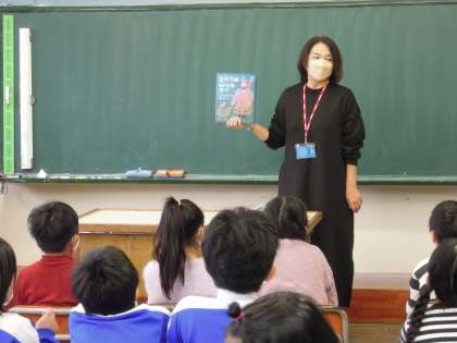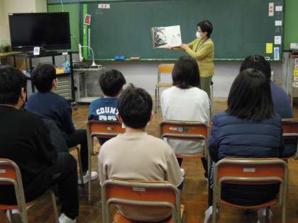 今日の読書タイムは、市立図書館よみきかせの会の方に読み聞かせをしていただきました。