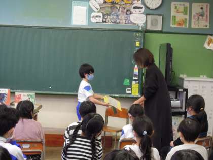 今年度最後の読み聞かせということで、下学年、上学年それぞれの代表が感謝の気持ちを込めてあいさつし、MTっ子全員分の手紙を手渡しました。
