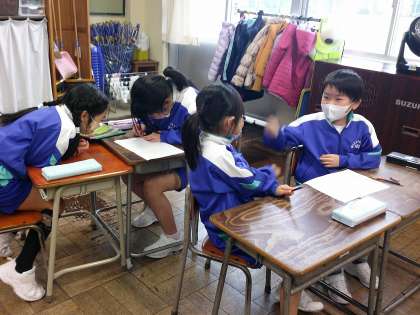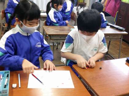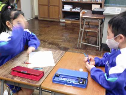 算数科では「どちらがひろい」の学習を行いました。友達とじゃんけんをして、勝った方が陣地を広げていく「陣地取りゲーム」をしました。陣地取りゲームをした後は、タイルの枚数を数え、どちらが多くの陣地を取ることができたのか比べました。