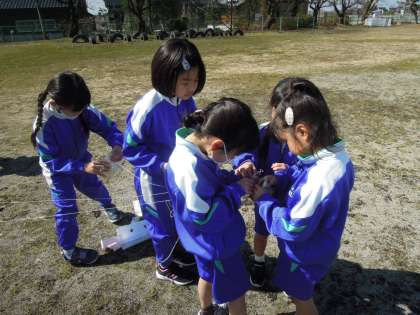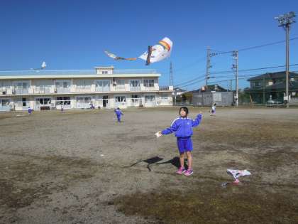 1年生は、生活科「むかしのあそび」で凧揚げをしました。やや風は弱かったのですが、快晴に恵まれ十分に楽しむことができました。途中、ひもが絡まるというトラブルがありましたが、協力してほどいていきました。自分の凧でなくても一生懸命に知恵を出し合い、解決しようとする姿は立派でした。