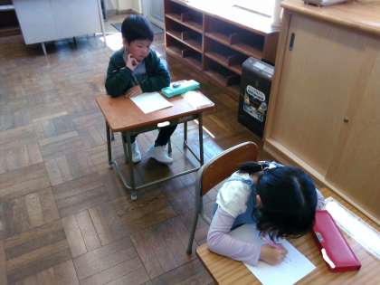 写真は、自由帳に絵を描いている様子です。「ランドセルを描きたい!」「好きなキャラクターを描こうかな!」と楽しそうに描いていました。