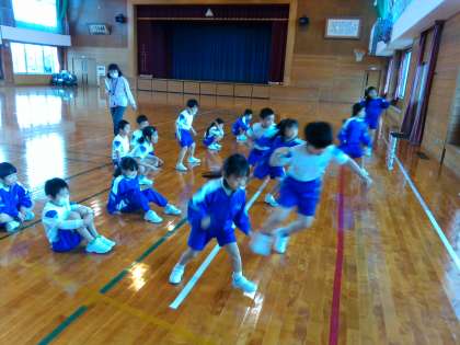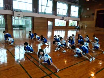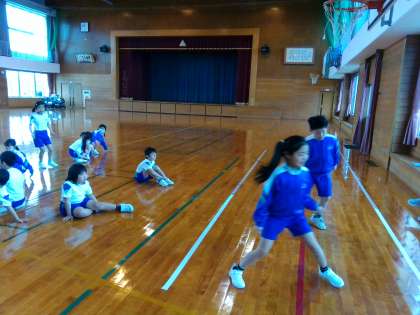 体育科の学習では、スポーツテストを行いました。今日は1〜3年生合同で反復横跳びを行いました。2・3年生は1年生の手本になって、やり方を見せてくれました。