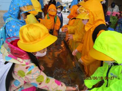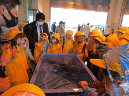 ホタルイカ見学会に行ってきました。子供たちは、ホタルイカ見学会を楽しみにしていました。ホタルイカを実際に触ると、子供たちは「ひょるひょるしている」や「ぷにぷにしている」と驚いた様子でした。ホタルイカの光っている様子については、「LEDライトみたい」「ダイヤモンドみたいにきらきらしている」「お星様みたい」と豊かに表現していました。体験から学ぶことは、とても多く、子供たちは生き生きとした表情でした。水橋のよさを感じ、この町が大好きという気持ちをもってくれたらと思います。