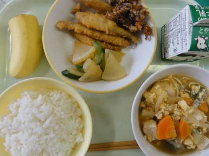 4月19日の給食には、富山県の名産ホタルイカの竜田揚げが出ました。サクサクとした食感がとてもおいしかったです。