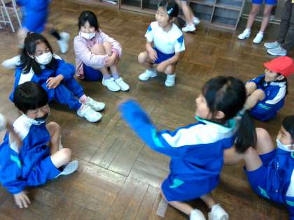 休み時間、2年生や4年生のお兄さんお姉さんが1年生教室に遊びに来てくれました。一緒にハンカチ落としをして楽しい時間を過ごしました。