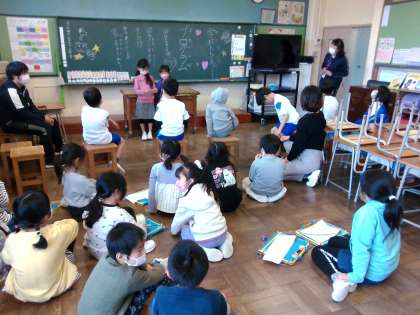 2年生に学校探検ウォークラリーに招待してもらいました。2年生とじゃんけんをしたり、迷路をしたり、学校に隠された「ひらがな」を探したりしました。1年生は笑顔で2年生と関わっていました。
