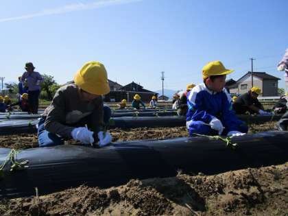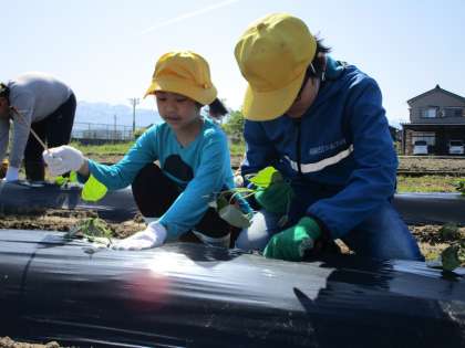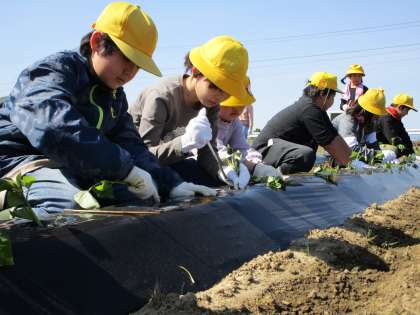 さつまいもの苗を植えました。グリーンパワーの方に植え方のコツを教えていただき、わりばしを使って植えていました。子供たちは大きく美味しく育ってほしいと願っていました。