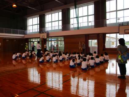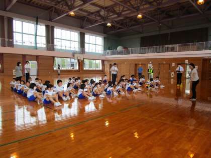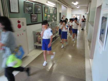 地震後、火災が発生したという想定で、避難訓練をしました。5つのきまりを守って安全に避難することができました。