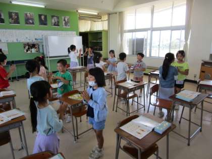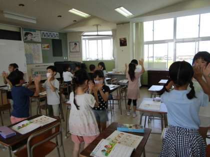 音楽では、「はくのまとまりをかんじとろう」という学習課題で、2拍子と3拍子の学習をしています。子供たちは、教材曲「たぬきのたいこ」の3拍子に合うダンスを考えています。学級のみんなの前で発表するため、いろいろな動きを取り入れながら楽しくダンスを考えている子供たちでした。