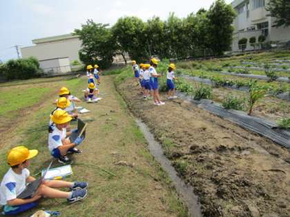 生活科で畑の野菜を観察しています。野菜がどんどん成長しています。子供たちは、触ったり、においをかいだり、数を数えたりして観察しています。「触ったら、さらさらしていました」「形はぎざぎざでした」「とうがらしみたいでした」「葉っぱの数は27枚でした」「花はトマトの花と同じでした」「表はつるつるでうらはざらざらでした」詳しく見ていこうとする目が育っています。