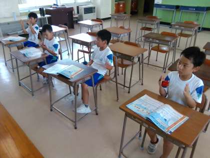 これまで学習した曲のリズムを確認し、カスタネットを使って曲に合ったリズムを叩きました。
