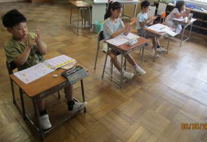 朝の啓明タイムに新出漢字の練習をしています。空書き・なぞり書きを繰り返すことで、一生懸命覚えようと頑張っています。