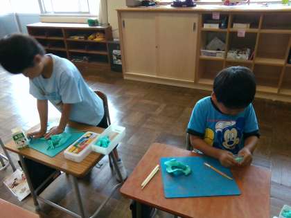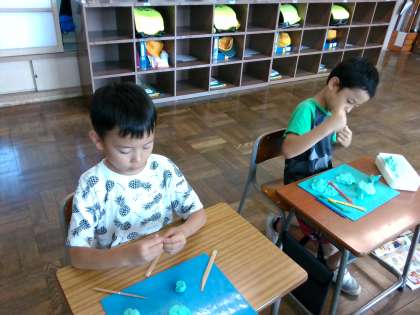 図画工作科「ごちそうパーティーをはじめよう!」では、粘土を使ってごちそうを作りました。「まるくしてピザをつくろう!!」「◯◯さんの分もつくっておくね」等と話しながら活動していました。