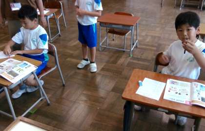 算数科「どちらがながい」では、プリントを見ながら課題を進めました。一人で考えたり、先生にヒントをもらいながら進めたりするなど、それぞれのやり方で学習していました。
