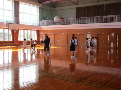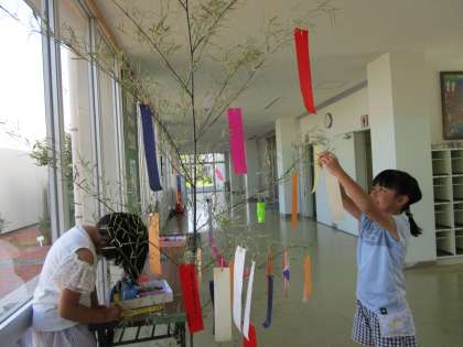 4年生と6年生が、体育館で元気にドッジボールをして、汗を流していました。児童玄関前廊下では、子供たちが短冊に願い事を書いて笹の葉につるしていました。