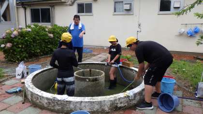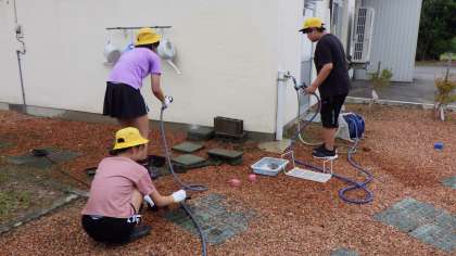 子供たちが計画したクリーン作戦、今日は池の掃除をしました。底や側面の汚れや池の中にあったブロックにたまった藻の塊を削ったり、ブラシでこすったり、各自ができることを見付けて動きました。濁っていた水がどんどん透き通ってきて、「これならメダカも住めそう」と、やりきった表情でした。