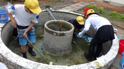 子供たちが計画したクリーン作戦、今日は池の掃除をしました。底や側面の汚れや池の中にあったブロックにたまった藻の塊を削ったり、ブラシでこすったり、各自ができることを見付けて動きました。濁っていた水がどんどん透き通ってきて、「これならメダカも住めそう」と、やりきった表情でした。