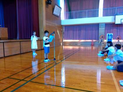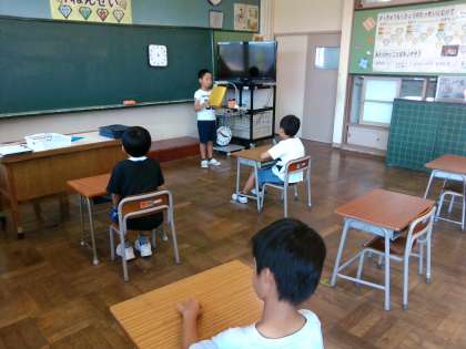 学年の代表児童が全校児童の前で1学期に頑張ったことを発表しました。これまでの練習の成果を発揮し、自分の言葉で話していました。他の児童も教室に戻り、学級の児童に向けて発表しました。照れながらも自分の成長を誇らしげに言葉にしている様子が印象的でした。