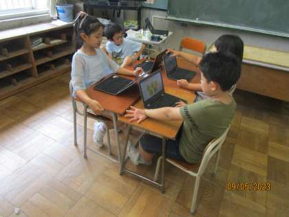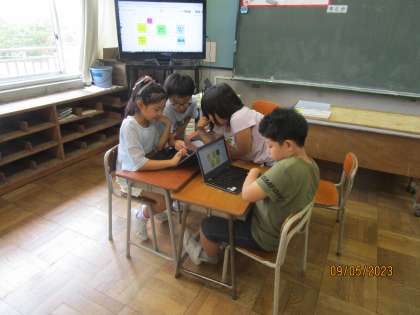 国語科「山小屋で3日間すごすなら」の学習では、山小屋に持って行く物を話し合いました。クロームブックを使って自分の考えをまとめたり、それをもとに話し合ったりしました。