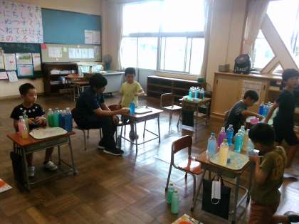 図画工作科「からふる いろみず」では、色水をつくり、できた色水から思いついた活動に取り組みました。「2色まぜてみます」「にじみたいに並べてみようかな」「かじきのいろにみえてきたからかじきをつくったよ」等と想像を膨らませながら思い付く活動を行っていました。
