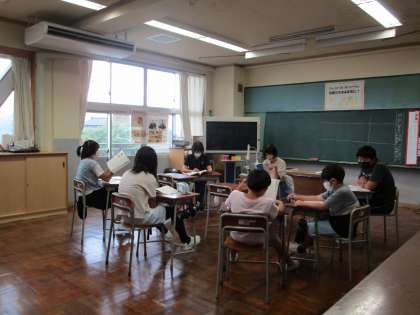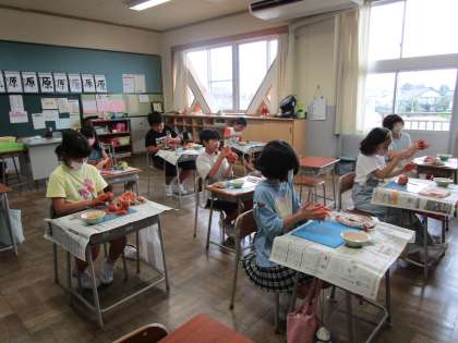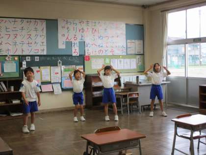 6年生は、輪になって順に国語の音読をしていました。1、2、3年生は、縄跳び発表会に向けてグループに分かれて自分たちの動きを考えたり、技の練習をしたりしていました。4年生は、水分量を考えながら粘土をこね、思い思いの形を作っていました。