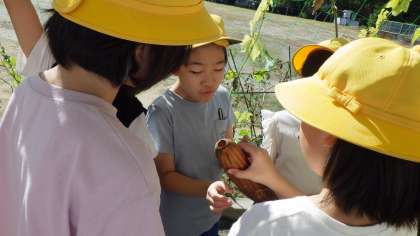 緑色の大きな実に混じって、皮が茶色いヘチマを発見した子供たち。実の下の部分には丸い穴が開いていました。