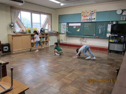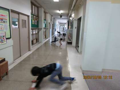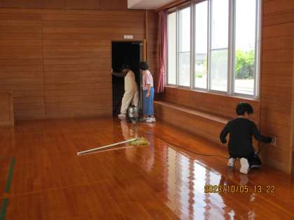 子供たちは、今日も学校をきれいにしようと、一生懸命に掃除をしていました。1階廊下、2年教室、体育館での様子です。