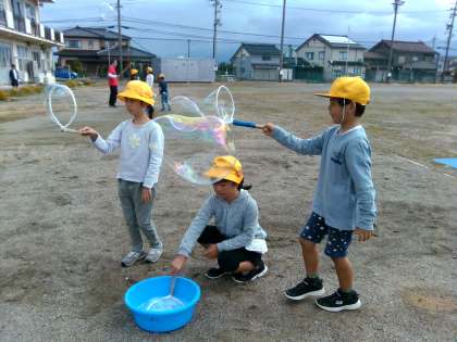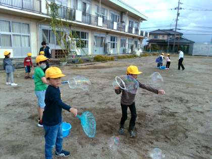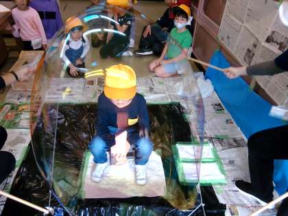 外部講師の方にお越しいただき、シャボン玉遊びをしました。様々な大きさのシャボン玉を作ったり、シャボン玉の中に入る経験をさせてもらったりしました。子供たちは、「大きなシャボン玉ができた!」「見て!」「あんな高いところまで上っていったよ!」とシャボン玉遊びを楽しんでいました。