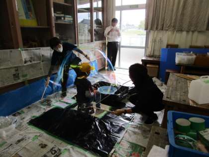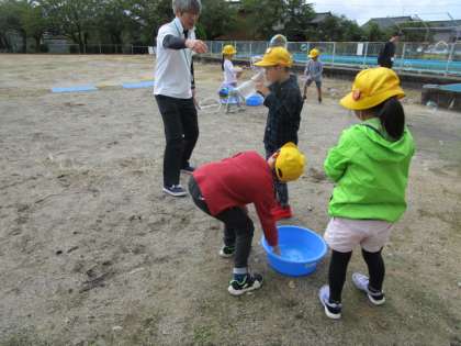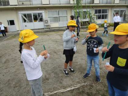 サイエンスカー訪問活動で、しゃぼん玉づくりをしました。「大きいしゃぼん玉ができて、とても楽しかったです」「大きいしゃぼん玉ができて、びっくりしました」「しゃぼん玉の中に入りました。すごくきれいでいつまでも入っていたかったです」と子供たちは、目をきらきらさせながら活動していました。