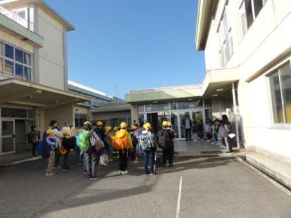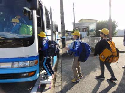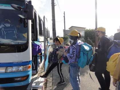 玄関では、下学年の子供たちが4年生と6年生を見送りました。バスに乗って、いよいよ宿泊学習へ出発です。