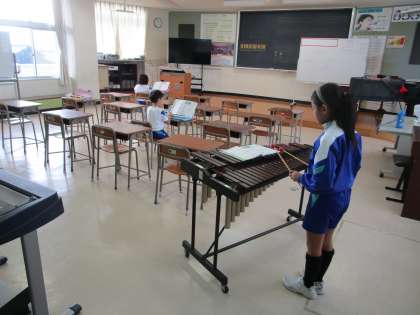 音楽科の学習では、木琴や鍵盤ハーモニカを使って、合奏を行っています。楽器を変えながら、練習しています。