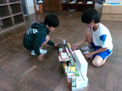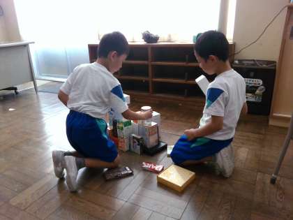算数科「かたちあそび」では、様々な大きさや形の箱を使って、いろいろな物を作ったり、似ている形を集めたりしました。形遊びを通して、角があることや長さの違い等、それぞれの形の特徴に気付きました。