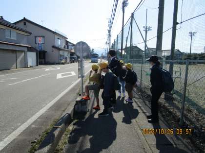3年生が校外学習に出発しました。青空が空一面に広がっています。富山市展望台から市の様子を見るには、最高の天気です。