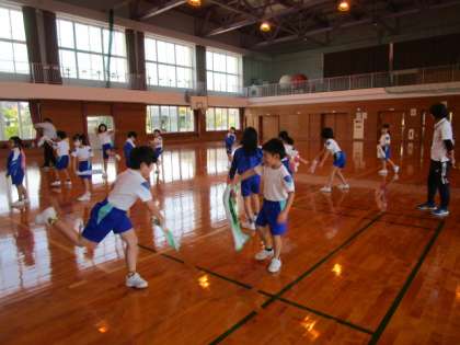 スポーツ指導員の先生によるソフトボール投げの指導がありました。まずは、腕の使い方を習いました。その後、実際に投げてみました。横向きから投げるようになるとどんどん遠く飛ばせるようになりました。最後に家でも練習できるようにタオルでの練習の仕方を教えてもらいました。