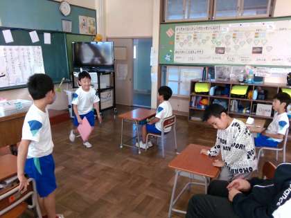 「ハロウィンパーティー」と題して、集会を行いました。まず、かぼちゃ鬼ごっこをしました。かぼちゃを持っている場合、タッチをされてもゲームを続けられるというルールで行いました。子供たちは、力いっぱい体育館を走り回り、いつもの鬼ごっことは違う楽しみを味わったようです。次に、折り紙を使ってハロウィンに関する物を切り取り、ひらひら揺れるおもちゃを作りました。工作係が作った見本を見ながら、コウモリやおばけ、魔女等を作っていました。