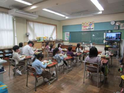 3枚目の写真は、生放送を見ながら給食を食べる2年生の子供たちです。