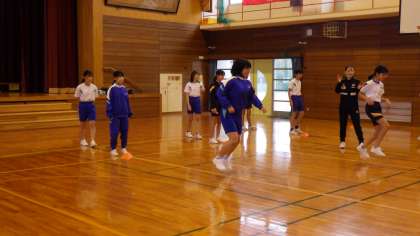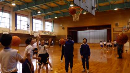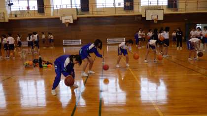 富山グラウジ-ズのコーチの皆さんから、バスケットボールのドリブルやパスを教わりました。「挑戦していこう」の目当てで、一生懸命に取り組みました。他校の友達とパスし合う等、自然な交流も生まれていました。最後のゴール合戦では、グループでゴール数を競い合い盛り上がりました。