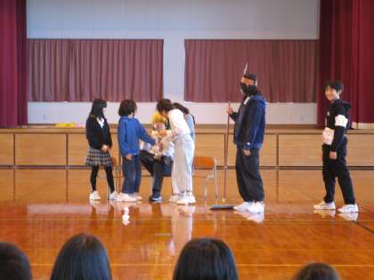 今日は、環境委員会が企画した「掃除について学ぼう集会」がありました。劇やクイズで、ほうきやちりとりの使い方等を楽しみながら学びました。おもしろくてためになる集会でした。
