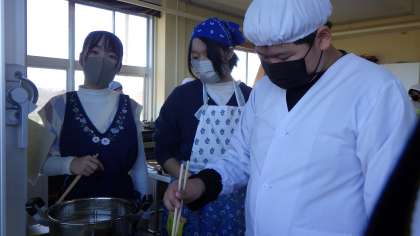 じゃがいも、玉ねぎ、ベーコンを使ったおかずを作りました。グループでメニューや作り方を相談し、手際よく作ることができました。出来上がった炒め物や粉ふきいもなどは、どれもとてもおいしかったようです。